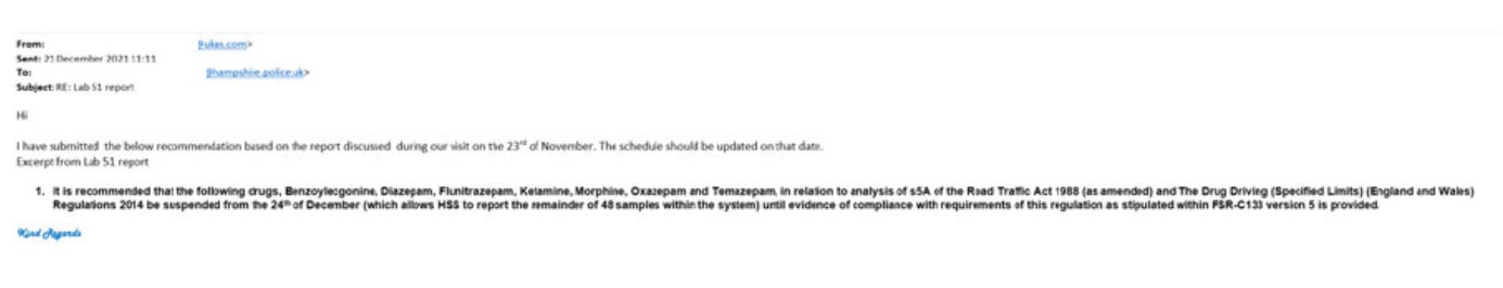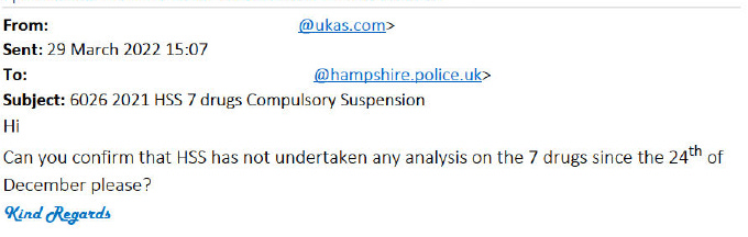 The key documents in the disclosure appear to be an email from HSS to Hampshire Constabulary setting out the current position on S5A analysis and an action plan. An email chain between UKAS and Hampshire police concerning the suspension of seven specific drugs. A summary email shared internally with HSS staff in December 2024, compiling the history into a single thread.