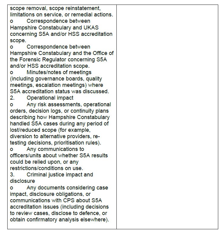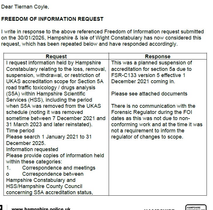 The FOI dates I specified were 1 January 2021 to 31 December 2025. Five years. A UKAS letter dated 29 August 2024 confirms that S5A accreditation was reinstated on that date. At no point during that period, according to Hampshire Constabulary, was there any communication with the Forensic Regulator about it.