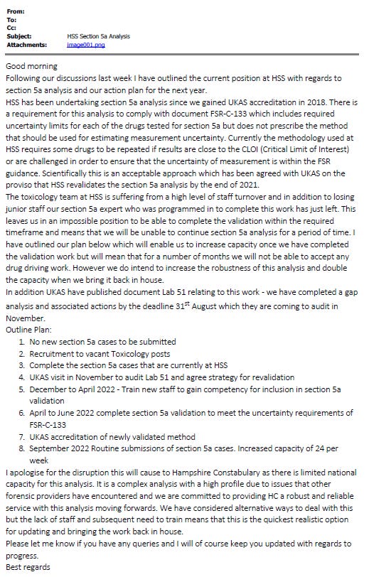 The email closed with an acknowledgement that the disruption would affect Hampshire Constabulary, and that there was “limited national capacity for this analysis.” It noted that S5A work was “a complex analysis with a high profile due to issues that other forensic providers have encountered.”