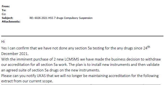 So there were two events, not one. In December 2021, UKAS compulsorily suspended seven drugs. In April 2022, HSS voluntarily withdrew all remaining S5A accreditation. The cover letter to the FOI response described the entire episode as “a planned suspension.” That description does not distinguish between a compulsory suspension imposed by UKAS and a voluntary withdrawal requested by HSS four months later. It treats them as a single event. They were not.