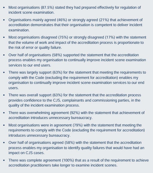“Unmet demand” = not enough crime scenes being attended. A significant reason for that is how police forces have addressed meeting the ISO standards, largely by requiring those who attend scenes to take the burden of the paperwork associated with the activity. More time behind the desk means less crime scenes attended. Obviously, the knock on effects of this downstream to forensic science labs mean a reduction of volume of submissions. The Forensic Regulator has already started looking at this and the results of a consultation survey revealed: